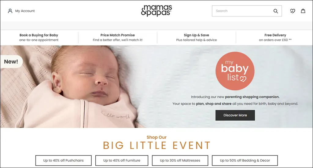 Mamas & Papas is a premium online baby store that has built a reputation for offering high-quality, stylish baby products with a focus on both design and functionality. The brand has been a trusted name for over 40 years, offering a wide range of baby essentials—from nursery furniture and strollers to clothing and feeding products.